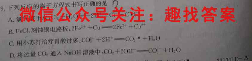 9.下列反应的离子方程式书写正确的是BA.氯气溶于水::Cl2+H2O2H^++Cl^-+ClO^-B.FeCl3刻蚀铜电路板:2Fe^3++Cu2Fe^2++Cu^2+C.用小苏打治疗胃酸过多:CO3^2-+2H^+CO2+H2OD.将过量CO2NaOH溶液中:CO2+2OH^-CO3^2-+H2O侯德榜创立了中国人自己的制碱工艺候氏制碱法,侯氏制碱的反应原理为NH+NH3+NaCl+CO2+H2ONaHCO3+NH4Cl.NaCl+CO+HO—NaHCO:+NHCl,它是在饱40水中中通人氨气,形成氨化的氯化钠饱和溶液(饱和氨盐水),再向其中通入二氧化碳。由于NaHCO的溶解度最小,故可NaHCO3NaHCO3析出NaHCO:晶体。实验室模拟侯氏制碱法,下列装置的选择及连接顺序正确的是DA.abcgh