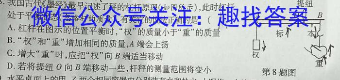 8.我国古代《墨经》最早记述了秤的杠杆原理(如图所示),此时杠杆处于平衡状态(忽略杆的质量),有关它的说法正确的是(FA.杠杆在图示的位置平衡时,“权”的质量小于“重”的质量B.“权”和“重”增加相同的质量,A端会上扬C.增大“重”时,应把“权”向B端适当移动D.若将提纽O向B端移动一些,杆秤的测量范围将变小第8题图