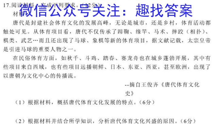 17.阅读材料,完成下列要求。(12分)材料唐代是封建社会体育文化的发展高峰,无论是城市,还是乡村,体育活动都触处可见。从体育项目看,唐代不仅传承了蹄鞠、缘竿、马术、摔跤(相扑)、棋类、武艺…而且还出现了马球、象棋等新的体育项目,据文献记载,太宗皇帝是引进马球的重要人物之一。在民俗体育方面,如秋千、斗鸡、踏春、赛龙舟也在城乡蓬勃开展,其中有些项目来自西域,也有些项目远播朝鲜、日本、东亚、西亚,甚至欧洲,出现了以唐朝为文化中心的传播流。–摘自王俊齐《唐代体育文化史》(1)根据材料,概括唐代体育文化发展的特点。(6分)(2)根据材料并结合所学知识,分析唐代体育文化兴盛的原因。(6分)