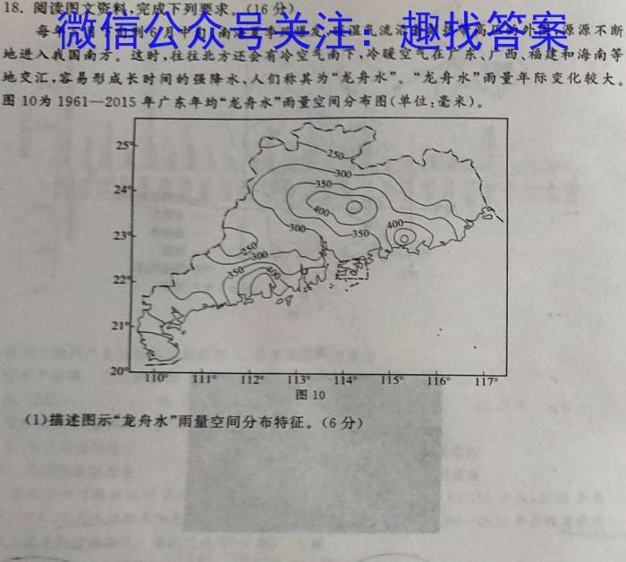 18.阅读图文资料,完成下列要求,(16分)每年5月下旬到6月中,南海夏李风爆发,暖湿气流沿着副热带高压的外围,源源不断地进入我国南方,这时,往往北方还会有冷空气南下,冷暖空气在广东、广西、福建和海南等地交汇,容易形成长时间的强降水,人们称其为“龙舟水”。“龙舟水”雨量年际变化较大。图10为1961-2015年广东年均“龙舟水”雨量空间分布图(单位:毫米)。20116^117°图10(1)描述图示“龙舟水”雨量空间分布特征。(6分)
