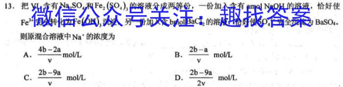 13.把VL含有Na2SO4和Fe2(SO4)3的溶液分成两等份,一份加入含有;amolNaOH的溶液,恰好使Fe^3+完全转化为Fe(OH)3,沉淀,另一份加入含bmolBaCl2的溶液,恰好使SO4^2-完全沉淀为BaSO4。则原混合溶液中Na^+的浓度为A.4b-2avmolLB.2b-avmolLC.2b-9avmolLD.2b-9a2vmolL