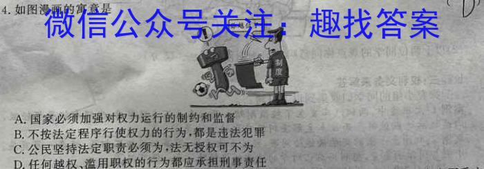 4.如图漫画的寓意是DA.国家必须加强对权力运行的制约和监督B.不按法定程序行使权力的行为,都是违法犯罪C.公民坚持法定职责必须为,法无授权可不为D.任何越权、滥用职权的行为都应承担刑事责任