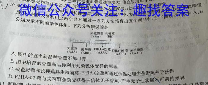 D.痒觉感受器可将兴奋以电信号的形式C.叮咬部位红肿可能是组织胺使毛細血管通透性增大,使血浆增加导致的①月满,长梗蕉软糯10.香蕉的的原形式传导至大脑皮层,让大脑皮层产生痒觉10.香蕉的原始种是尖苞野蕉和长梗蕉两个野生芭蕉属品种,尖苞野蕉味甜但多籽,长梗蕉软糯徂m酸涩。科研人员利梗蕉两个野生芭蕉属品种,尖苞示,图酸涩。科研人员利用这两个品种通过一系列方法培育出五个新品种,如下图所示,图中A、B分别表示不同的染色体组。下列分析错误的是个尖苞野蕉长梗蕉(((BB)大麦克南华蕉FHIA-02蕉FHIA-03FHIA-03蕉金手指蕉(AA(ABB)(AAAA)(AABB(AAAB)A.图中的五个新品种香蕉不都可育B.图中培育的香蕉新品种利用到染色体变异的原理C.尖苞野蕉和长梗蕉具生殖隔离,FHIA-02蕉可通过低温处理尖苞野蕉种子获得FHIA-O2D.FHIA-O2D.FHIA-02蕉与尖苞野蕉杂交获得三倍体无子香蕉,产生无子性状属不可遗传变异