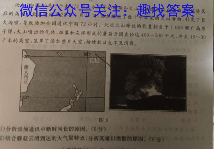 16.阅读图文材料,完成下列要求。(19分)汤加(如图9)是一个由172个大小不等的珊瑚和火山岛屿组成以农业为主、经济落后的岛国。北京时间2022年1月15日,汤加爆发了数十年罕见的火山活动,引发了巨大海啸,导致汤加全国通讯中断72小时。此次火山释放的能量相当于1000颗广岛原子弹,火山喷出的气体、烟雾和灰烬形成的蘑菇云团直径达400~500千米,冲至19~30千米的高空,笼罩了汤加整片天空,持续数日也不见消散。图9(1)分析汤加通讯中断时间长的原因。(6分)(2)结合蘑菇云团到达的大气层特点,分析其难以消散的原因。(6分)