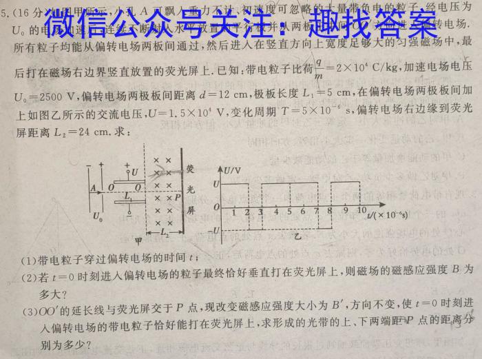 15.(16分)如图甲所示,小孔A可飘入重力不计、初速度可忽略的大量带负电的粒子,经电压为U0的电场加速后,连续不断射人水平放置的平行板并从两板正中间00’方向进入偏转电场.所有粒子均能从偏转电场两板间通过,然后进人在竖直方向上宽度足够大的匀强磁场中,最后打在磁场右边界竖直放置的荧光屏上.已知:带电粒子比荷qm=210^4C/kg,加速电场电压U0=2500V,偏转电场两极板间距离d=12cm,极板长度L1=5cm,在偏转电场两极板间加上如图乙所示的交流电压,U=1.510^4V,变化周期T=510^-6s,,偏转电场右边缘到荧光屏距离L2=24cm.求:(1)带电粒子穿过偏转电场的时间t;(2)若t=0时刻进入偏转电场的粒子最终恰好垂直打在荧光屏上,则磁场的磁感应强度B为多大?(3)OO’的延长线与荧光屏交于P点,现改变磁感应强度大小为B’,方向不变,使t=0时刻进人偏转电场的带电粒子恰好能打在荧光屏上,求形成的光带的上、下两端距P点的距离分别为多少?