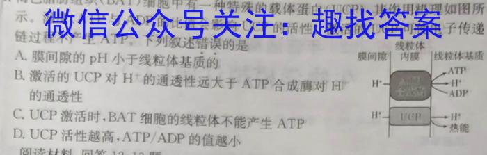 1.褐色脂肪组织(BAT)细胞中有一种特殊的载体蛋白(UCP),其作用机理如图所示。温度、ATP与ADP的比值会影响UCP的活性激活的UCP可使电子传递链过程不产生ATP。下列叙述错误的是A.膜间隙的pH小于线粒体基质的B.激活的UCP对H^+的通透性远大于ATP合成酶对H^+的通透性C.UCP激活时,BAT细胞的线粒体不能产生ATPD.UCP活性越高,ATP/ADP的值越小