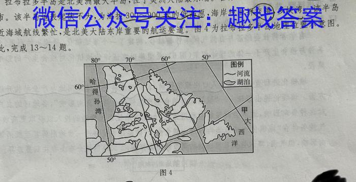 拉布拉多半岛是北美洲最大半岛,位于美洲大陆最东端。在第四纪冰川时期,该半岛冰川广布。该半岛地表起伏不大,为海拔300~900米的低高原,海岸线曲拆交错,多峡湾。该半岛附近海域航线繁忙,是北美大陆东岸重要的航运要道。图4为拉布拉多半岛地理位置示意图。据此,完成13∼14题。60^图4