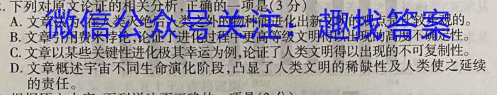 2.下列对原文论证的相关分析,正确的一项是(3分)A.文章认为,在人类灭绝后人类之外的物种能进化出新文明的观点是比较乐观的。B.文章引用费米悖论,论证了进化过程中更高等级文明得以出现的高度不确定性。关键性进化极其幸运为例,论证了人类文明得以出现的不可复制性。D.文章概述宇宙不同生命演化阶段,凸显了人类文明的稀缺性及人类使之延续的责任。