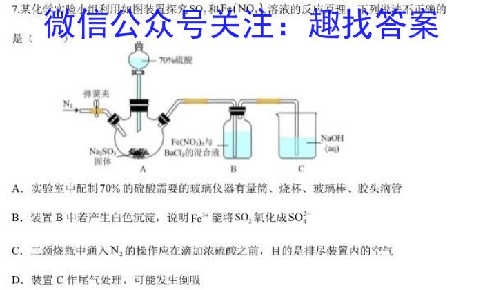 7.某化学实验小组利用如图装置探究SO2和Fe(NO3)3溶液的反应原理,下列说法不正确的是()A.实验室中配制70%的硫酸需要的玻璃仪器有量筒、烧杯、玻璃棒、胶头滴管B.装置B中若产生白色沉淀,说明Fe^3+SO2氧化成SO4^2-C.三颈烧瓶中通入N2的操作应在滴加浓硫酸之前,目的是排尽装置内的空气D.装置C作尾气处理,可能发生倒吸