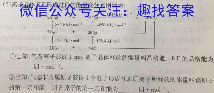 (2)离子晶体KF形成过程的能量变化如图所示:2K*(g)+2F(g)-2F(g)-1642kJmol^-12KF(s)837.6kJmol^-1-656.4kJmol^-12K(g)2F(g)178.4JJmol^-1158.8kJmol^-12K(s)+F2(g)①已知:气态离子形成1mol离子晶体释放的能量叫晶格能。KF的晶格能为kJmol^-1。②已知:气态非金属原子获得1个电子形成气态阴离子所释放的能量叫该原子的第一亲和能。则F原子的第一亲和能为kJmol^-1。