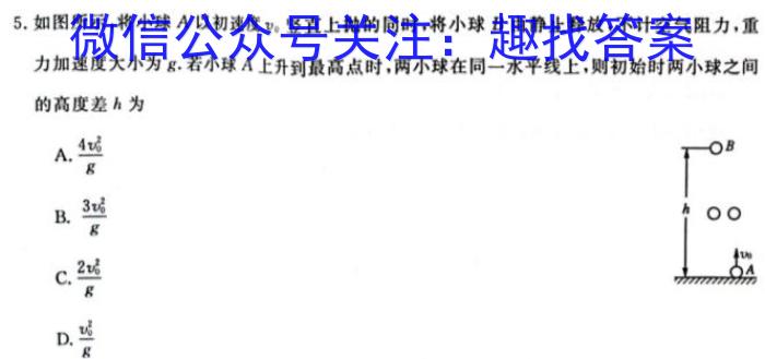 5.如图所示,将小球A以初速度v0竖直上抛的同时,将小球B由静止释放,不计空气阻力,重力加速度大小为g.若小球A上升到最高点时,两小球在同一水平线上,则初始时两小球之间的高度差h为A.4v0^2gB.3v0^2gC.2v0^3g