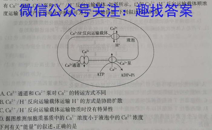 5.正常活细胞内的Ca^2+浓度维持在相对稳定的状态。液泡膜上存在多种钙离子转运蛋白,主要有Ca^2+通道、Ca^2+泵和Ca^2+/H^+反向运输载体,如图所示。已知Ca^2+/H^+反向运输载体顺浓H^+化学梯度可为Ca^2+运输供能,下列叙述错误的是度运输Ca^2+Ca^2+/H+反向运输载体液泡HCa^2+Ca^2+*通道Ca^2+泵Ca^2+ATPADP+PiA.Ca^2+通道和Ca^2+泵对Ca^2+的转运方式不同B.Ca^2+/H^+反向运输载体运输H^+的方式是协助扩散C.Ca^2+/H^+反向运输载体运输物质时没有特异性D..据图推测细胞质基质中的Ca^2+浓度小于液泡中的Ca^2+浓度