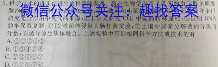 3.科学技术的进步促进生物科学的发展。高中生物学中常见的实验有①豚鼠胰腺腺泡细胞分泌蛋白的合成和运输;②人细胞和小鼠细胞融合实验;③鲁宾和卡门研究光合作用中氧气的来源;④卡尔文研究CO2中碳的转移途径;⑤证明DNA的半保留复制;⑥T2噬菌体侵染大肠杆菌实验;⑦土壤中尿素分解菌的分离与计数;⑧诱导原生质体融合。上述实验中用到相同科学方法或技术的有A.①②③④⑤B.①③④⑤⑧C.②③④⑤⑦D.①③④⑤⑥