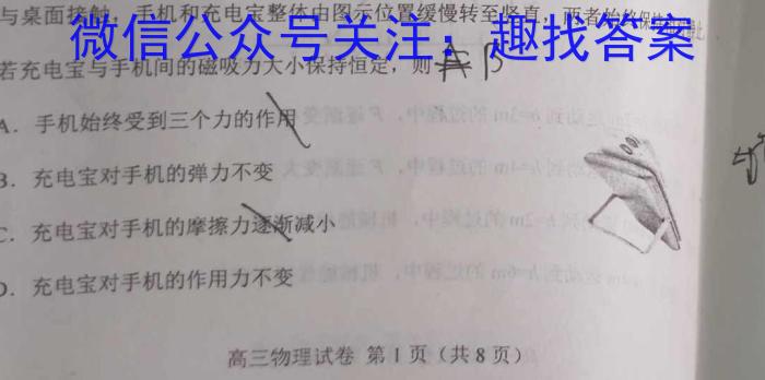 2.磁吸无线充电宝本身具有磁性,手机可以直接吸附在充电宝上进行无线充电,不与桌面接触,手机和充电宝整体由图示位置缓慢转至竖直,两者始终保持相对静若充电宝与手机间的磁吸力大小保持恒定,则BA.手机始终受到三个力的作用B.充电宝对手机的弹力不变C.充电宝对手机的摩擦力逐渐减小D.充电宝对手机的作用力不变,在篮球比察中,投篮的投射角度会影响投篮的命中率。在某次投篮中,篮球投出速度42m/s,45^大小为4m/,方向与水平面成45°角。投球点在篮筐下方,竖直距离为0.35m。取10m/s^2,A10ms,则篮球进筐的速度大小为m0.35m。mysin45°A.3m/sB