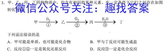 3.甲、乙、丙、丁四种物质中,均含有相同的某种元素。在一定条件下它们之间存在如图转化关系:下列说法错误的是A.甲可能是单质,也可能是化合物B.甲与丁反应可能生成盐C.反应①②一定是氧化还原反应D.反应③一定是化合反应