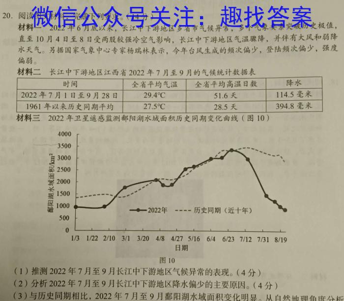 20.阅读图文材料,完成下列要求。(14分)材料一2022年6月底以来,长江中下游地区多省市气候异常,多个气象要素突破历史极值,直至10月4日至8日受两股较强冷空气影响,长江中下游地区气温骤降,并伴有大风和弱降水天气。另据国家气象中心专家杨瑞林表示,今年台风生成的频次偏少,登陆频次偏少,强度偏弱。材料二长江中下游地区江西省2022年7月至9月的气候统计数据表材料三2022年卫星遥感监测鄱阳湖水域面积历史同期变化曲线(图10日期图10(1)推测2022年7月至9月长江中下游地区气候异常的表现。(4分)(2)分析2022年7月至9月长江中下游地区降水偏少的主要原因。(4分)