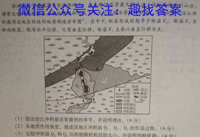 涪江发源于青藏高原东北部岷山,是嘉陵江右岸最大的支流。该江穿越龙门山后,携带大量碎屑物质在山前地带堆积形成多个大小规模不等的冲积扇。下图示意“涪江冲积扇周边地区的地形地质构造分布图”,其中F1断层形成时期早于断层F2。,断层F1为斜向断层,既有水平位移,又有垂直位移。断层F2,主要以垂直位移为主。(1)指出涪江冲积扇发育最快的季节,并说明理由。(6分)(2)从地质作用角度,描述该地区冲积扇Q1、Q2、Q3的形成过程。(6分)(3)比较冲积扇Q2和Q3沉积物颗粒粒径的大小,并说明判断依据。(4分)