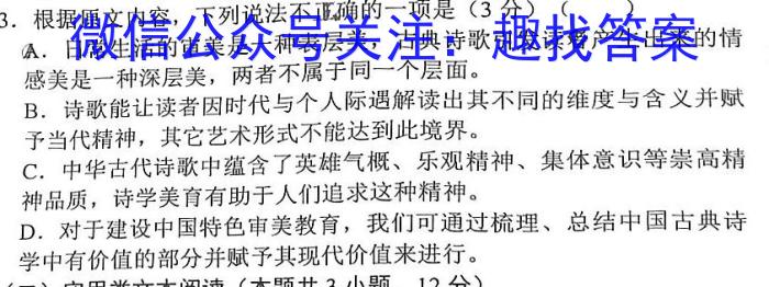3.根据原文内容,下列说法不正确的一项是(3分)()A.日常生活的审美是一种表层美,古典诗歌引发读产生出来的情感美是一种深层美,两者不属于同一个层面。B.诗歌能让读者因时代与个人际遇解读出其不同的维度与含义并赋予当代精神,其它艺术形式不能达到此境界。C.中华古代诗歌中蕴含了英雄气概、乐观精神、集体意识等崇高精神品质,诗学美育有助于人们追求这种精神。D.对于建设中国特色审美教育,我们可通过梳理、总结中国古典诗学中有价值的部分并赋予其现代价值来进行。