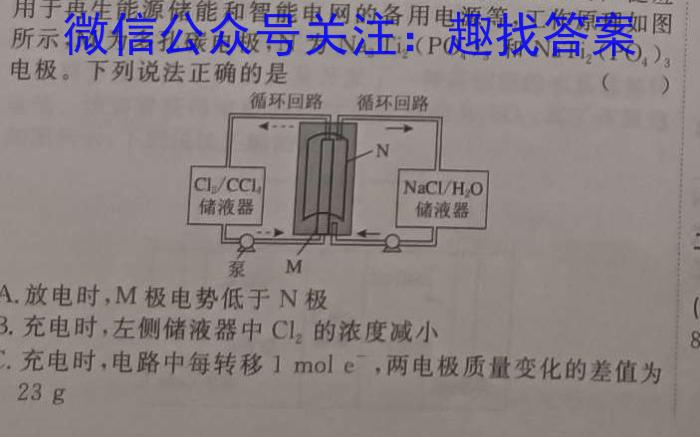 4.无膜氯液流电池是一种先进的低成本高储能电池,可广泛应用于再生能源储能和智能电网的备用电源等,工作原理如图所示,M为多孔碳电极,N为Na3Ti2(PO4)3和NaTi2(PO4)电极。下列说法正确的是(A.放电时,M极电势低于N极B.充电时,左侧储液器中Cl2的浓度减小C.充电时,电路中每转移1mole^-,两电极质量变化的差值为23gD.放电时,N极的m,NNa3T2(P极反应式为NaT2(PO4)3+2Na^++2e2eP