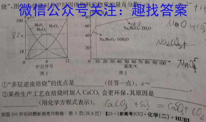 SO2,等废气(1)焙烧过程中采用“多层逆流多层逆流(空气从炉底进入,钼精矿经经粉碎后从炉顶进入)焙1为焙烧时各炉层固体物料的物质的量百分数(φ)。CO35²+H①“多层逆流焙烧”的优点是(任答一点)。x=。②某些生产工艺在焙烧时加入CaCO,会更环保,其原因是CaCO3(用化学方程式表示)。lc0;+s0=80t(0lc0;+s0=80t(0)CCJ.【23·(新高考)CCJ·化学(二