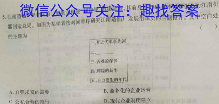5.江南造船厂是中国第三艘航空母舰“福建舰”的建造者,其前身是1865年李鸿章创办的江南机器制造总局。如图为某学者按时间顺序研究江南造船厂发展沿革史的主题设计。其中空白处()的主题为A.自强求富的需要B.商务化的企业运营C.公私合营的推行D.现代企业制度建立