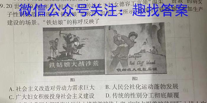 9.20世纪50、0年代,相对于中国传统之于妇女德容工言须“温柔”“贤淑”的弱女子性别规范,出现了“铁姑娘”的称呼,如图1、2所示,展现了“铁姑娘”参加生产建设的场景。“铁姑娘”的称呼反映了A.社会主义改造对劳动力需求巨大B.人民公社化运动蓬勃发展C.广大妇女积极投身社会主义建设D.传统的性别分工彻底颠覆