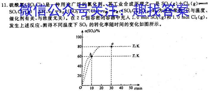 11.硫酰氯(SO2Cl2)是一种用途广泛的氯化剂。其工业合成原理之一是SO2(g)+Cl2(g)—SO2Cl2(g)HvE=kEc(SO2)c(Cl2),v=kc(SO2Cl2)(kE,k水为速率常数,只与温度、催化剂有关,与浓度无关)。在2L恒容密闭容器中充入1.0molSO2(g)和1.0molCl2(g),发生上述反应,测得不同温度下SO2的转化率随时间的变化如图所示。下列叙述正确的是A.该反应的△H>0B.b点v(T1)=v(T2)C.0∼10min内平均反应速率:v(T1)>v(T2)D.a点时,k=40k
