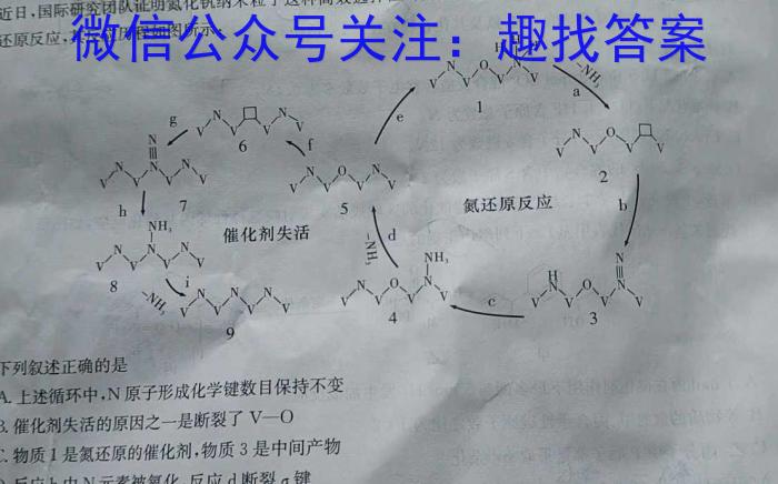 13.近日,国际研究团队证明氨化钒纳米粒子这种高效选择性的催化剂,能够在温和的条件下实现电化学氮气还原反应,其反应历程如图所示:HHHNaN.1veN6fNN2h75氮还原反应bNVH3催化剂失活NNNdvNNH3N8N0.NN0、vc493下列叙述正确的是A.上述循环中,N原子形成化学键数目保持不变B.催化剂失活的原因之一是断裂了V-OC.物质1是氮还原的催化剂,物质3是中间产物D.反应h中N元素被氧化,反应d断裂键