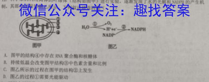 12.科学家们利用离体的叶绿体(结构如图甲)进行实验,逐渐发现了水的光解和NADPH的产生机制,其部分过程如图乙所示,下列叙述错误的是()①O2NADPHNADPP图乙A.图甲的结构④中存在RNA聚合酶和核糖体B.持续低温会改变图甲结构③中色素含量和比例C.图乙所示的过程在图甲的结构②上发生D.图乙的过程①需要光能驱动