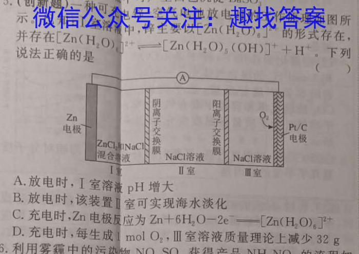 5.飞瓶5.(创新题)一种可充电锌-空气电池放电时的工作原理如图所示。已知:I室符液中,锌主要以[Zn(H,O,的形式存在,[Zn(H2O)6]并存在[Zn(H,.[Zn(H2O)[Zn(H2O)5(OH)]^++H^+。说法正确的是,下列()A.放电时,I室溶液pH增大B.放电时,该装置室可实现海水淡化C.充电时,电极反应为Zn+6H2O-2e^-[Zn(H2O)6]^2+D.充电时,每生成1molO2,Ⅲ室溶液质量理论上减少32g