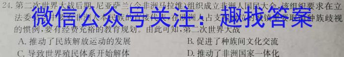 24.第二次世界大战后期,尼亚萨兰(今非洲马拉维)组织成立非洲人国民大会,该组织要求在立法委员会中要有非洲人本民族的直接代表,在欧洲人占支配地位的城镇里要取消种族歧视的惯例,要有经费充裕的教育规划。由此可知,第二次世界大战A.推动了民族解放运动的发展B.促进了种族间文化交流C.导致世界殖民体系开始解体D.推动了非洲国家一体化