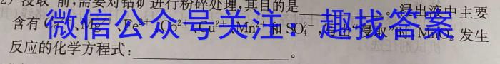 (2)“浸取”前,需要对钴矿进行粉碎处理,其目的是。浸出液中主要含有Ca^2+、Mg^2+、Fe^2+、Co^2+、Cu^2+、Mn^2+和SO4^2-,写出“浸取”时,MnO2发生反应的化学方程式:。