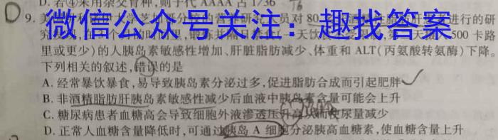09..美国伊利诺伊大学芝加哥分校的营养研究人员对80名非酒精性脂肪肝患者进行的研究发现,在3个月的时间里,锻炼并隔日禁食(一天饮食不受限制,第二天摄入500卡路里或更少)的人胰岛素敏感性增加、肝脏脂肪减少、体重和ALT(丙氨酸转氨酶)下降。下列相关的叙述,错误的是A.经常暴饮暴食,易导致胰岛素分泌过多,促进脂肪合成而引起肥胖B.非酒精脂肪肝胰岛素敏感性减少后血液中胰岛素含量可能会上升C.糖尿病患者血糖高会导致细胞外液渗透压升高使尿量减少D.正常人血糖含量降低时,可通过胰岛A细胞分泌胰高血糖素,使血糖含量上升