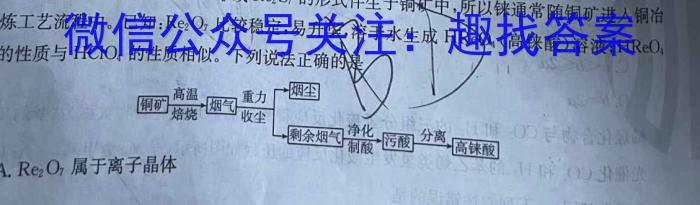 11.自然界中的铼(75Re)常以ReS2或Re2S7的形式伴生于铜矿中,所以铼通常随铜矿进人铜治炼工艺流程中。已知:Re2O7比较稳定,易升华,溶于水生成HReQ4(高铼酸)溶液:HReO4的性质与HClO4的性质相似。下列说法正确的的是烟尘铜矿高温烟气焙收尘净化剩余烟分离高铼酸A.Re2O7属于离子晶体