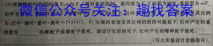(3)该植物的叶色同时受E、e与F、ff两对基因控制,基因型为的甲为绿叶,基因型为eeF的甲为紫叶,将绿叶甲(早)与紫叶甲()杂交,取F1红叶甲自交得F1,F2的表型及其比例为红叶绿叶紫叶:黄叶=7:3:1:1,F2出现的表型及其比例的原因可能是F1红叶产生的基因型为的離配子或雄配子致死,请设计实验探究F1红叶产生的哪种配子致死:A(写出实验设计思路即可)。GN关实验,回答下列问题:鼠DRG神经元中的PTEN蛋白参与痒觉信号传递。为操究PTEN蛋白的作用,研究着进行了相用(1)机体在(填部位)产生痒觉的过程(填属于”或“不属于”)反射,兴奋在神“不属于射奋在神经纤维上以的形式双向传导,兴奋在神经元间单向传递的原因是,(2)抓挠引起皮肤上的触觉、痛觉感受器有效挥觉信号的上传,因此痒觉减弱,