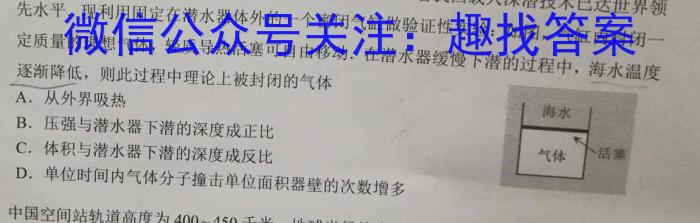 6.“奋斗号”潜水器2020年成功坐底马里亚纳海沟,标志着我国载人深潜技术已达世界領先水平,现利用固定在潜水器体外的一个密闭气缸做验证性实验:如图,气缸内封闭一定质量的理想气体,轻质导热活塞可自由移动.在潜水器缓慢下潜的过程中,海水温度逐渐降低,则此过程中理论上被封闭的气体A.从外界吸热B.压强与潜水器下潜的深度成正比C.体积与潜水器下潜的深度成反比D.单位时间内气体分子撞击单位面积器壁的次数增多