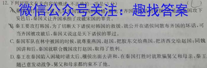 12.下列对原文有关内容的概述,不正确的一项是(3分)秦国攻打安邑之前,先对齐国说宋国的过错,避免了齐国对安邑的救援,可是当秦国攻下安邑后,秦国又让齐国承担了攻破宋国的罪责。B.秦王要攻打韩国,为了切断天下诸侯对韩国的救援,就公开在诸侯间散布齐国的坏话,可当齐国被攻破后,秦国又说这是天下诸侯的罪过。C.秦国军队在林中被困的时候,就尊重燕国、赵国,把胶东交给燕国,把济西交给赵国;同魏国讲和后,秦国就联合魏国攻打赵国,取得了胜利。D.秦王在秦国陷人困境时请太后、穰侯出面去讲和,在秦国打胜时就欺骗舅父和母亲,秦王随己意发动战争,舅父和母亲都约束不了他。