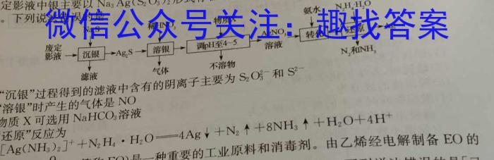 113.13.废定影液中银主要以Na:Ag(SO)形式存在,实验室用废定影液制备Ag的流程如图所Na3Ag(S2O3)2示。下列说法错误的是氨水N2H4H2ONa2S稀HNO3物质XAgNO3转化还原原Ag废定定沉银银调pH至545影液溶液N2和NH3不溶物滤液气体S^2-A.“沉银”过程得到的滤液中含有的阴离子主要为S2O3^2-和B.“溶银”时产生的气体是NOC.物质X可选用NaHCO3溶液D.“还原”反应为4[Ag(NH3)2]^++N2H4H2O4Ag+N2+8NH3+H2O+4H^+