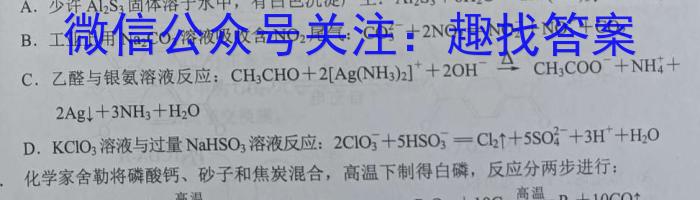 8.下列反应方程式书写错误的是是DA.少许Al2S3固体溶于水中,有白色沉淀产生:Al2S3+6H2O2Al(OH)3+3H2SB.工业上用Na2CO3溶液吸收含NO2尾气:CO3^2-+2NO2NO2^-+NO3^-+CO2C.乙醛与银氨溶液反应:CH3CHO+2[Ag(NH3)2]^++2OH^-CH3COO^-+NH4^++2Ag+3NH3+H2OD.KClO3溶液与过量NaHSO3溶液反应:2ClO3^-+5HSO3^-Cl2+5SO4^2-+3H^++H2O