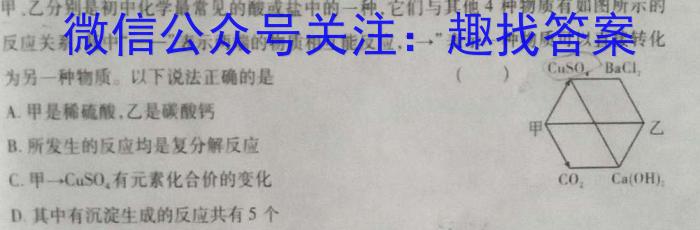 9.甲、乙分别是初中化学最常见的酸或盐中的一种,它们与其他4种物质有如图所示的反应关系,其中“”表示两端的物质相互能反应,“→”表示一种物质可以直接转化为另一种物质。以下说法正确的是()A.甲是稀硫酸,乙是碳酸钙B.所发生的反应均是复分解反应C.甲一+CuSO4有元素化合价的变化D.其中有沉淀生成的反应共有5个