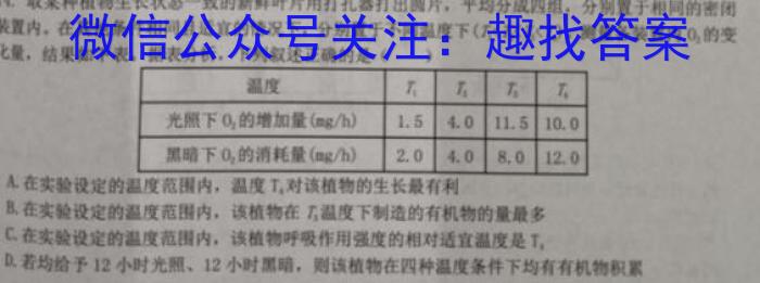 14.取某种植物生长状态一致的新鲜叶片用打孔器打出圆片,平均分成四组,分别置于相同的密闭装置内。在其他条件相同且适宜的情况下,分别置于不同温度下(T1<T2<T3<T4).测量各装置内O2的变化量,结果如下表。据表分析,下列叙述正确的是()A.在实验设定的温度范围内,温度T4对该植物的生长最有利B.在实验设定的温度范围内,该植物在温度下制造的有机物的量最多C.在实验设定的温度范围内,该植物呼吸作用强度的相对适宜温度是TnD.若均给予12小时光照、12小时黑暗,则该植物在四种温度条件下均有有机物积累