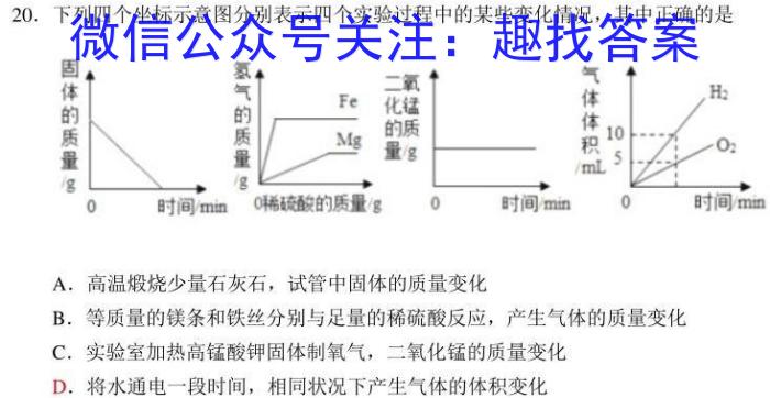 20.下列四个坐标示意图分别表示四个实验过程中的某些变化情况,其中正确的是A.高温煅烧少量石灰石,试管中固体的质量变化B.等质量的镁条和铁丝分别与足量的稀硫酸反应,产生气体的质量变化C.实验室加热高锰酸钾固体制氧气,二氧化锰的质量变化D.将水通电一段时间,相同状况下产生气体的体积变化