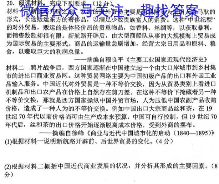 20.阅读材料,完成下列要求。(12分)材料一新航路开辟之前,欧洲的对外贸易主要是由冒险商人采用人背马驮的形式,长途贩运东方的奢侈品,以满足少数贵族富人的消费。这种“中世纪型”的对外贸易,贩运的是体轻价昂的贵重物品,如香料、丝绸等,以获取暴利,而销售数额却很有限。新航路开辟后,由大型商船队从事的大规模海上贸易成为国际贸易的主要形式。商品的运输量急剧增加,经营大宗日用品和原料、粮食,以赚取巨大的利润总量。——摘编自穆良平《主要工业国家近现代经济史》材料二鸦片战争后,西方国家逐渐在中国建立起一个由大口岸城市到乡村集市的进出口商业贸易网。这种贸易网络主要为中国初级产品的出口和外国工业品输入服务。中国近代对外贸易是一种不等价交换,因为从贸易类别上看进口机制品和出口农产品在价格上自然存在剪刀差。在这种不等价下掩藏着另一种不等价交换,那就是西方国家操纵中国外贸市场,人为压低中国农副产品收购价格,造成了一种人为的不等价交换。例如中国出口大宗商品丝和茶,在19世纪70年代以前价格尚可由生产成本来预算,中国可自行控制,但19世纪70年代后,丝和茶的出口价格开始逐渐脱离成本价格,受到外商的摆布。——摘编自徐峰《商业与近代中国城市化的启动(1840—1895)(1)根据材料一说明新航路开辟前、后世界贸易的变化。(4分)(2)根据材料二概括中国近代商业发展的状况,并分析其形成的主要因素。(8分)