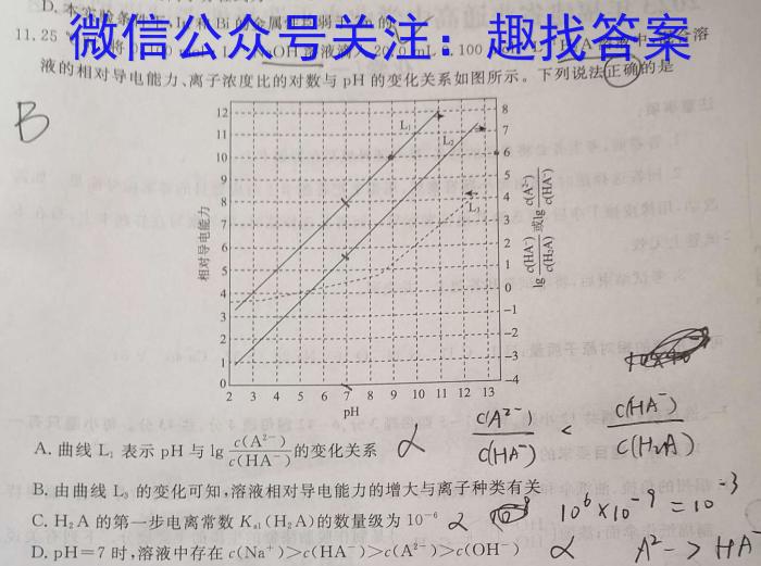 11.25^Cv时,将0.100mol·LNaOH溶液滴入20.0mL0.100mol·L-HA溶液中,混合溶0.100molL^-1NaOH20.0mL0.100molL^-1H2A的是液的相对导电能力、离子浓度比的对数与pH的变化关系如图所示。下列说法正确的是B&+1)(1)(A.曲线L1表示pH与c(A^2-)c(HA^-)的的变化关系B.由曲线L3的变化可知,溶液相对导电能力的增大与离子种类有关106×10-9=10-3C.H2A的第一步电离常数Ka1(H2A)的数量级为10^-6D.pH=7时,溶液中存在c(Na^+)>c(HA^-)>c(A^2-)>c(OH^-)A²->HA