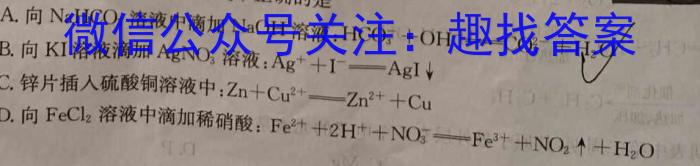 17.下列相关反应的离子方程式不正确的是A.向NaHCO3溶液中滴加NaOH[溶液:HCO3^-+OH^+H2OB.向KI溶液滴加AgNO3溶液:Ag^++I^-AgIC.锌片插入硫酸铜溶液中:Zn+Cu²Zn²+CuZn+Cu^2+Zn^2++CuFeCl2D.向FeCl溶液中滴加稀硝酸:Fe+2H*+NOFeFe^2++2H^++NO3^-Fe^3++NO2+H2O叶十NO十HO