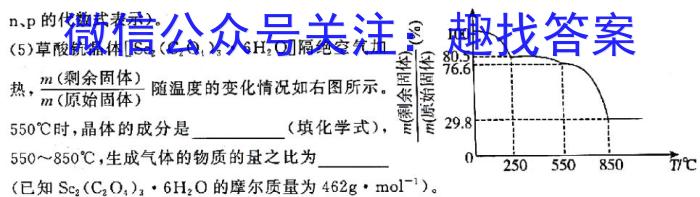 (5)草酸航晶体[Sc2(C2O1)36H2O隔绝空气加(余床、随温度的变化况如右图所示示。550^C时,晶体的成分是(填化学式),550550^C,,生成气体的物质的量之比为(已知Sc2(C2O4)36H2O的摩尔质量为462gmol^-1)