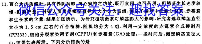 11.百合为肉质鳞叶,具有养阴润肺,清心安神之功效,既可食用,也可药用。但鳞茎生长速度较慢,影响产量。科研人员根据鳞茎直径的大小分为四组,测定了鳞茎中细胞分裂素、赤霉素和生长素的含量,结果如图所示。为研究植物激素对鳞茎膨大的影响,研究者选取鳞茎直径大小为1.5cm左右的百合植株,随机均分为4组,利用一定浓度的赤霉素合成抑制剂(PP333)、细胞分裂素类调节剂(CPP和赤霉素(GA)处理,一段时间后,测定鳞茎直径大小,结果如表所示,下列分析错误的是A.据图推测,百合鳞茎直径的大小与细胞分裂素和赤霉素的含量有关B.由图和表可知,赤霉素对百合鳞茎的生长起到抑制作用C.推测外施CPPU后,百合鳞茎中内源赤霉素含量可能降低D.由图和表可知,激素是通过控制基因的表达来控制鳞茎的生长