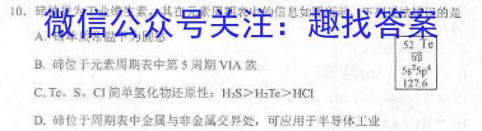 10.被誉为工业锥生素,其在元素周期表中的信息如图所示,下列说法错误的是A.磷单质常温下为固态B.位于元素周期表中第5周期VLA族C.Te、S、C1简单氢化物还原性:H2S>H2Te>HClD.蹄位于周期表中金属与非金属交界处,可应用于半导体工业