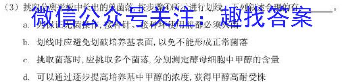 (3)挑取分离平板中长出的单菌落,按步骤④所示进行划线。下列叙述合理的有。a.为保证无菌操作,接种针、接种环使用前都必须灭菌b.划线时应避免划破培养基表面,以免不能形成正常菌落c.挑取菌落时,应挑取多个菌落,分别测定酵母细胞中甲醇的含量d.可以通过逐步提高培养基中甲醇的浓度,获得甲醇高耐受株