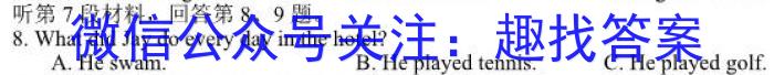 听第7段材料,回答第8、9题。8.What did Jay do every day in the hotel?A.He swam. BB.He played tennis.C.He played golf.